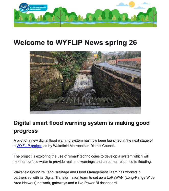 West Yorkshire Flood Innovation Programme Spring 2026 Newsletter 20th March 202620th March 2026 by icasp Stay in the loop with the latest WY FLIP updates by subscribing to our newsletter here Read the full newsletter here Read the full newsletter here